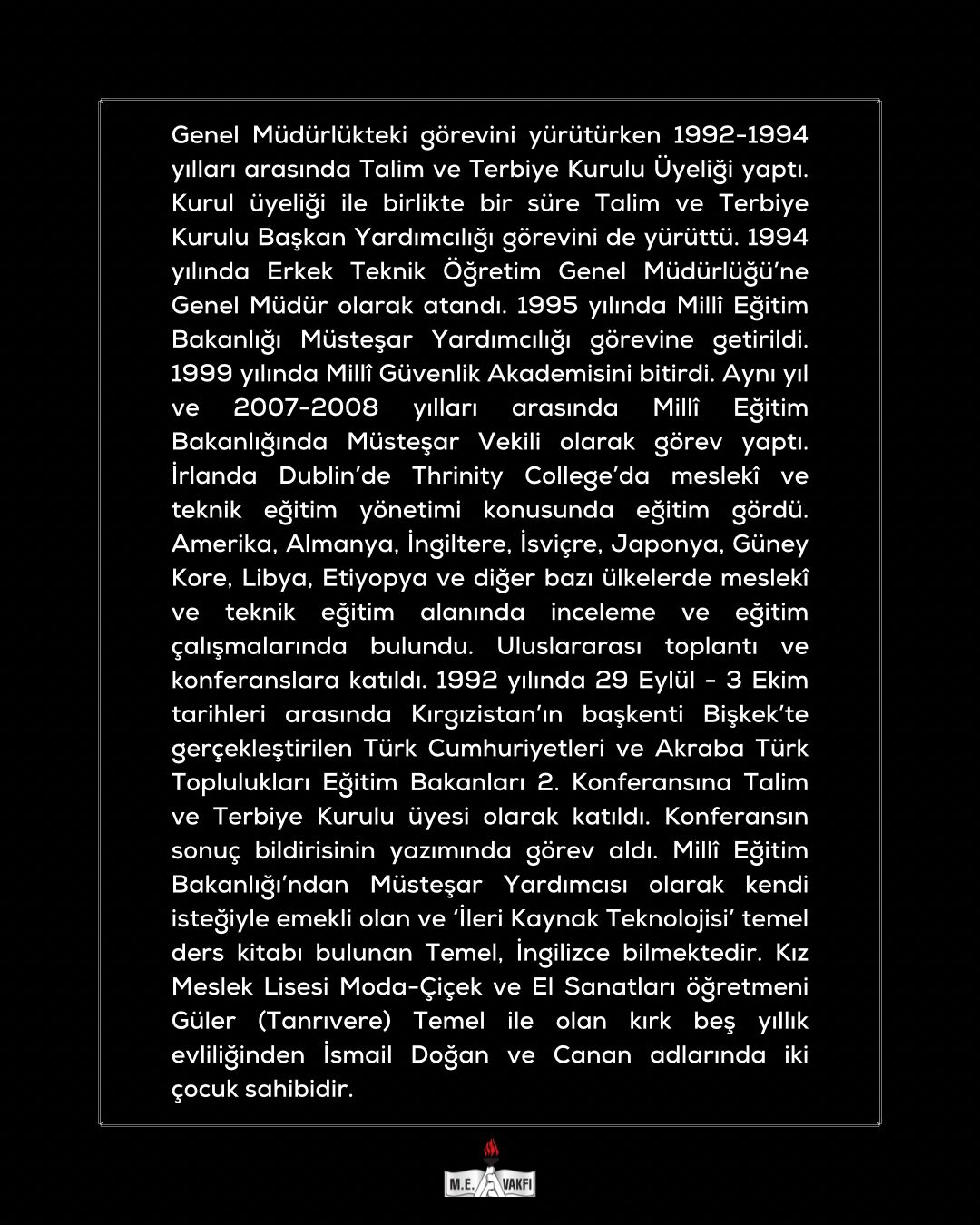 Millî Eğitim Bakanlığı (E.) Müsteşar Yardımcısı, (E) Erkek Teknik Öğretim Genel Müdürü, Millî Eğitim Vakfı Önceki Dönem Başkanı ve Yönetim Kurulu Üyemiz, eğitime gönül vermiş değerli büyüğümüz Sayın Mehmet TEMEL’in vefatını derin bir üzüntüyle öğrenmiş bulunuyoruz. Merhuma Allah’tan rahmet yakınlarına ve Millî Eğitim Vakfı ailesine başsağlığı diliyoruz.