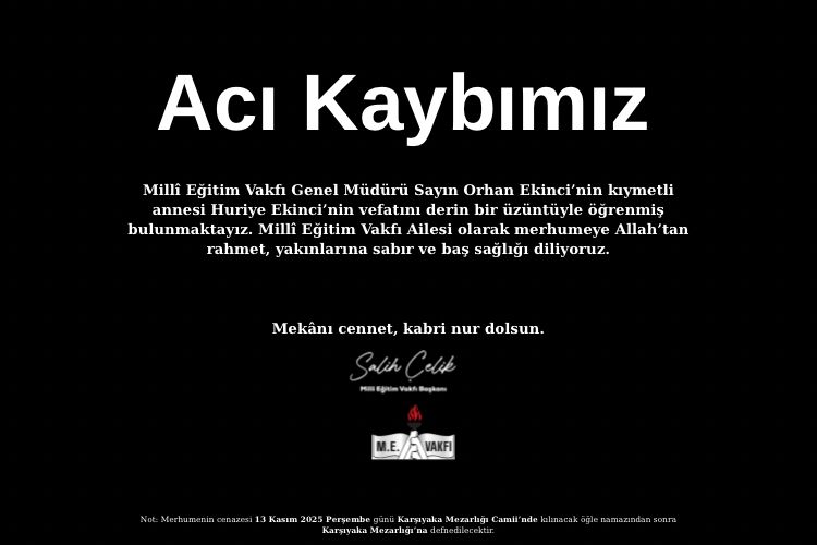 Millî Eğitim Vakfı Genel Müdürü Sayın Orhan Ekinci’nin kıymetli annesi Huriye Ekinci’nin vefatını derin bir üzüntüyle öğrenmiş bulunmaktayız. Millî Eğitim Vakfı Ailesi olarak merhumeye Allah’tan rahmet, yakınlarına sabır ve baş sağlığı diliyoruz.