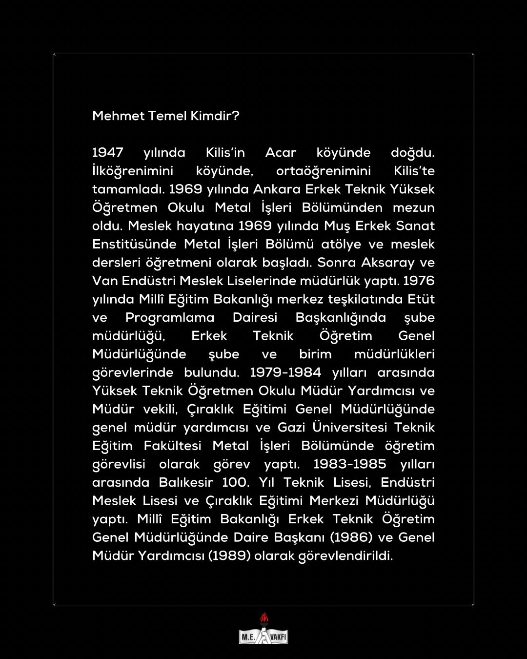 Millî Eğitim Bakanlığı (E.) Müsteşar Yardımcısı, (E) Erkek Teknik Öğretim Genel Müdürü, Millî Eğitim Vakfı Önceki Dönem Başkanı ve Yönetim Kurulu Üyemiz, eğitime gönül vermiş değerli büyüğümüz Sayın Mehmet TEMEL’in vefatını derin bir üzüntüyle öğrenmiş bulunuyoruz. Merhuma Allah’tan rahmet yakınlarına ve Millî Eğitim Vakfı ailesine başsağlığı diliyoruz.
