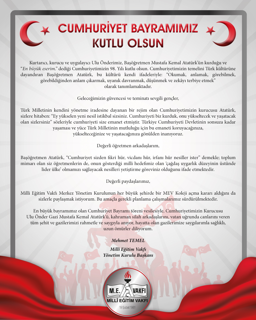 Başkanımız Mehmet Temel’in Cumhuriyet Bayramı Kutlama Mesajı